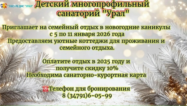 👋Приглашаем вас провести незабываемые дни с 05.01.2026 по 11.01.2026 в санатории “Урал”!